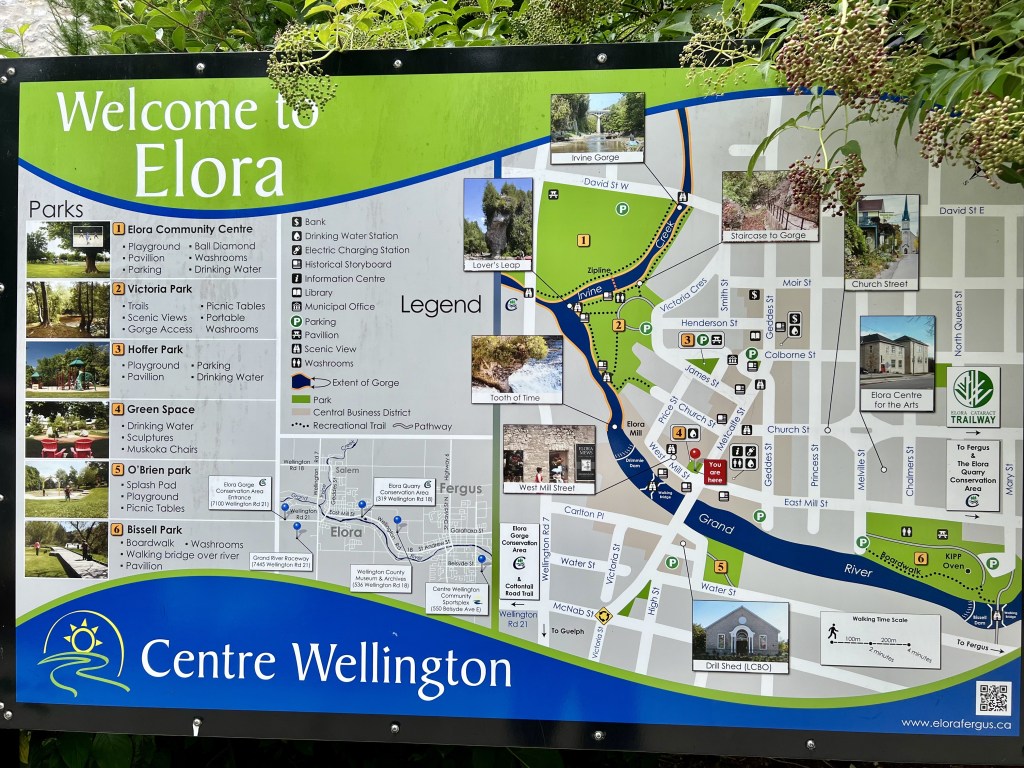 Elora is a community in the township of Centre Wellington, Wellington County, Ontario, Canada. Elora boasts a variety of unique architecture made with limestone as well as several stunning natural sights to explore. Below, it can be seen on the map some of the key points in the surrounding area such as a variety of parks as well as the names of the different streets within the town area.