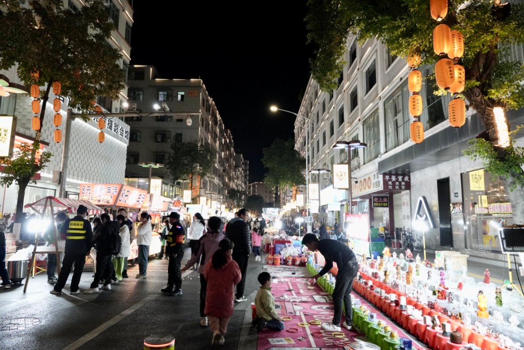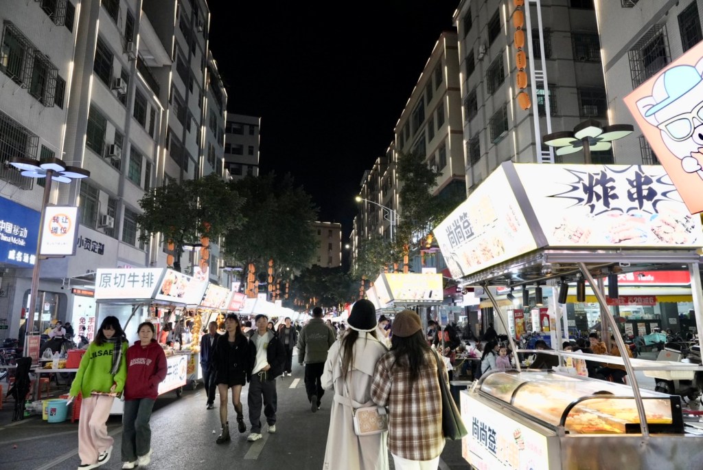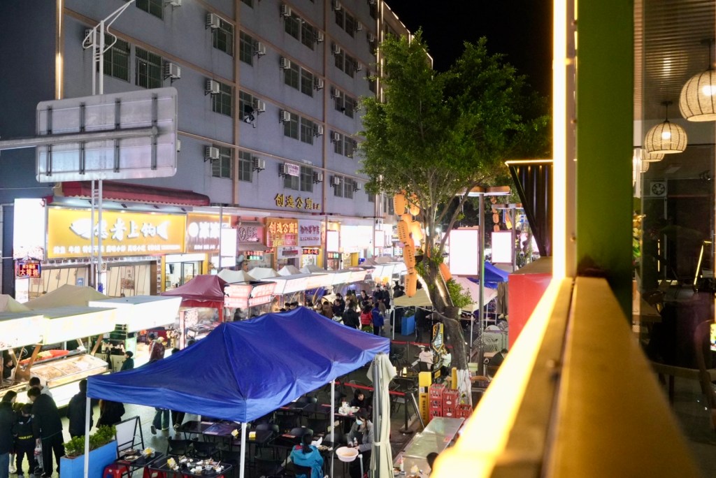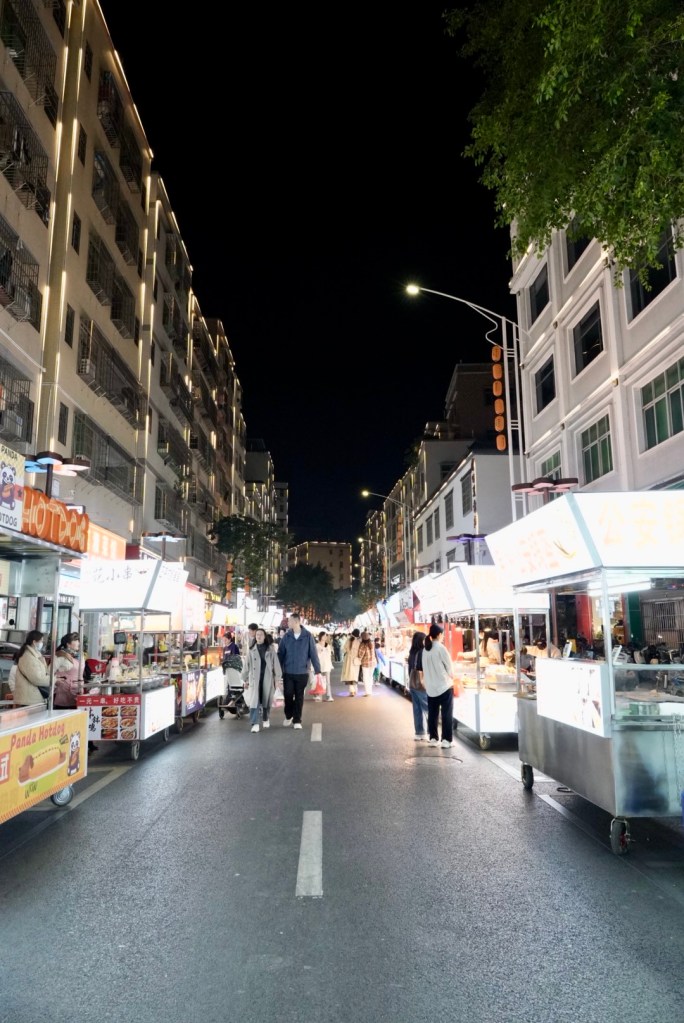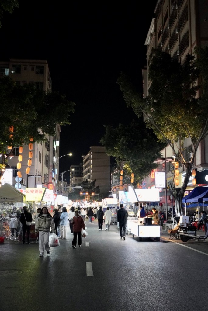 步行街拥有各种各样的街头小吃,从各种豆腐、肉类和蔬菜到各种甜点,应有尽有。街道上美食摊位灯火通明,加上几个灯笼,更添风采。继续前行,建筑物也被点亮,为该地区增添了额外的吸引力。