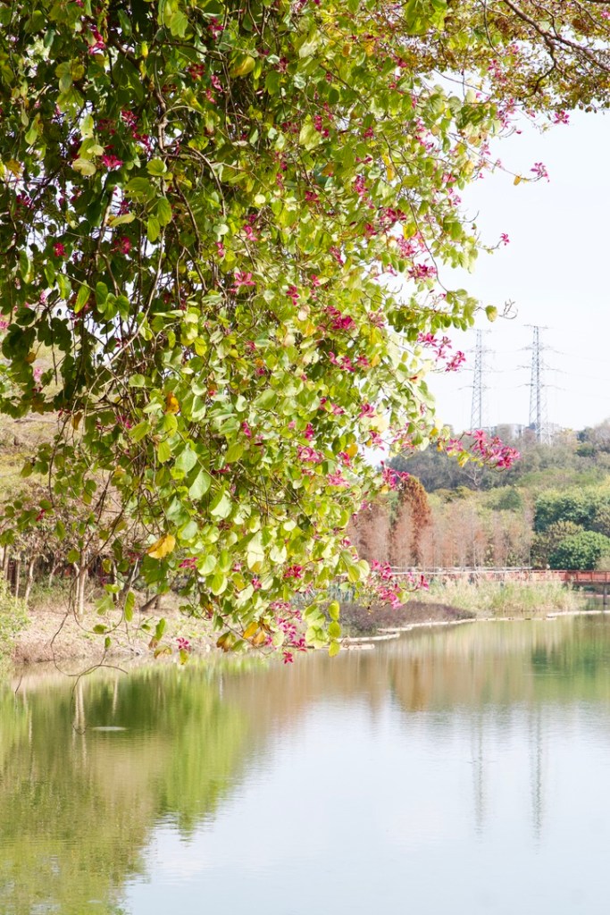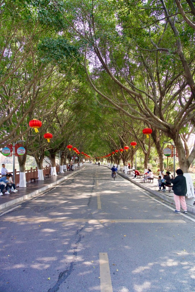 Walking (or running) along the path, you’ll encounter a variety of plants—many of which I had never seen before, coming from Toronto, Canada. Guangzhou, with its subtropical climate, enjoys mild winters, allowing blossoms and flowers to flourish even at this time of year. As the Lunar New Year approaches, lanterns are hung throughout Huadu Park and the rest of Guangzhou, adding to the festive atmosphere.