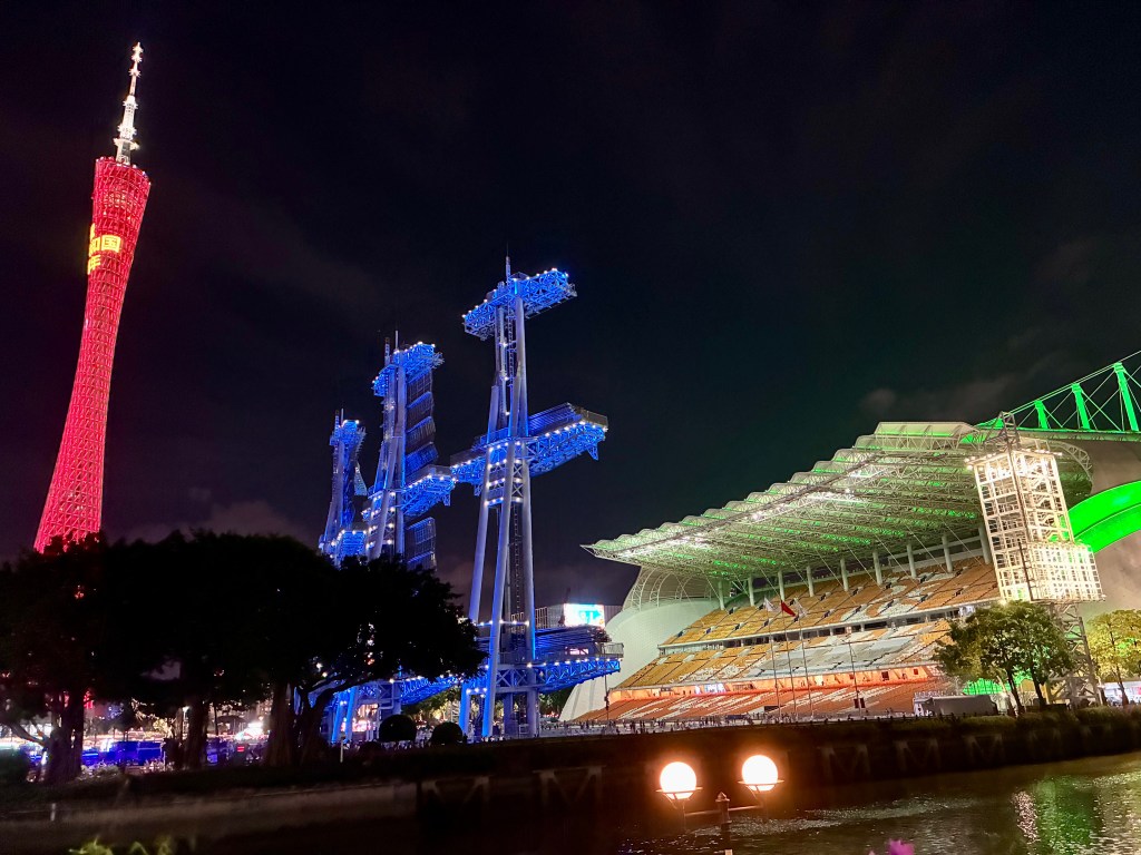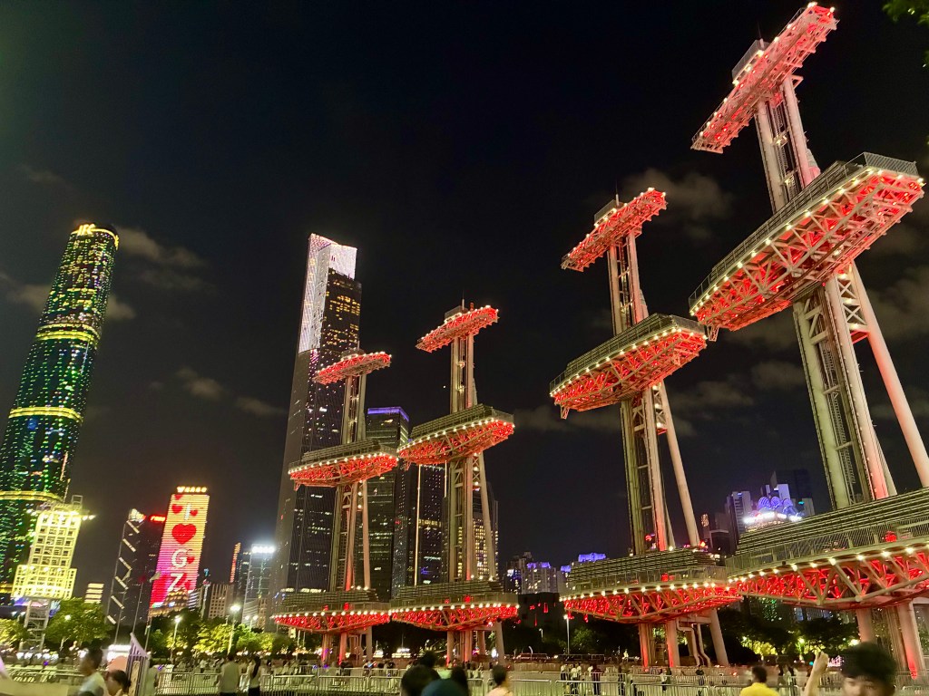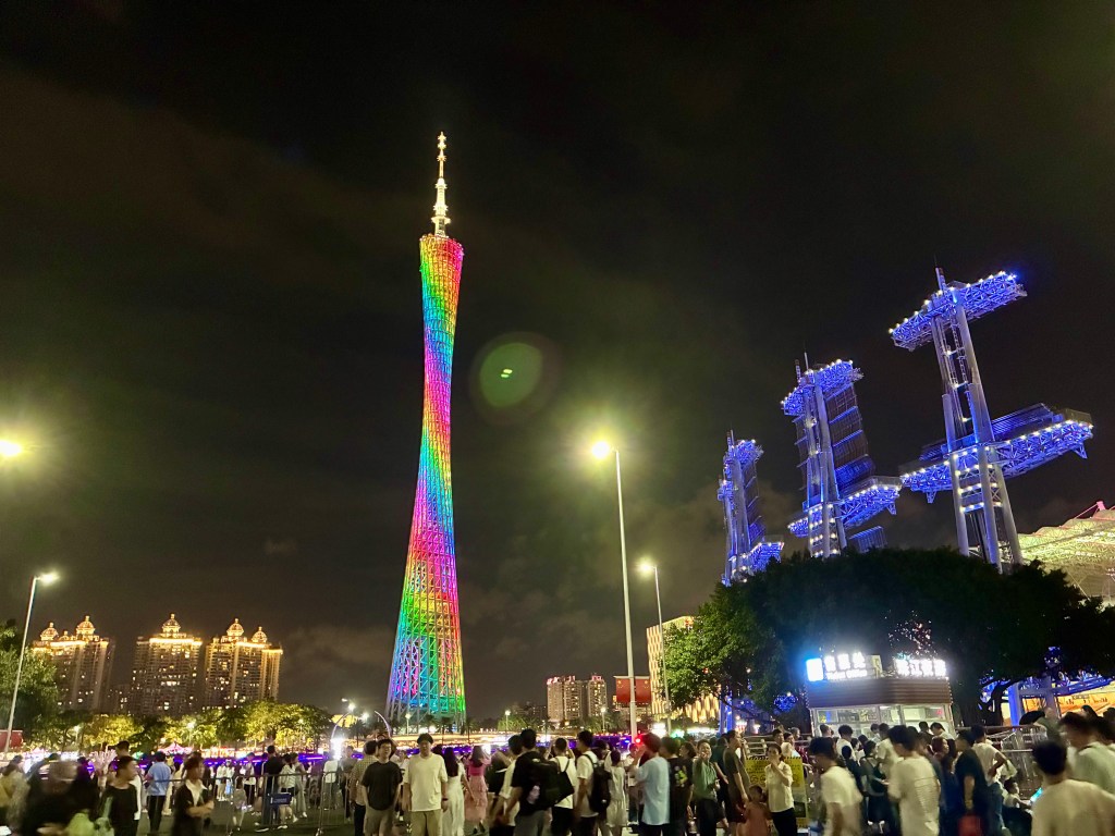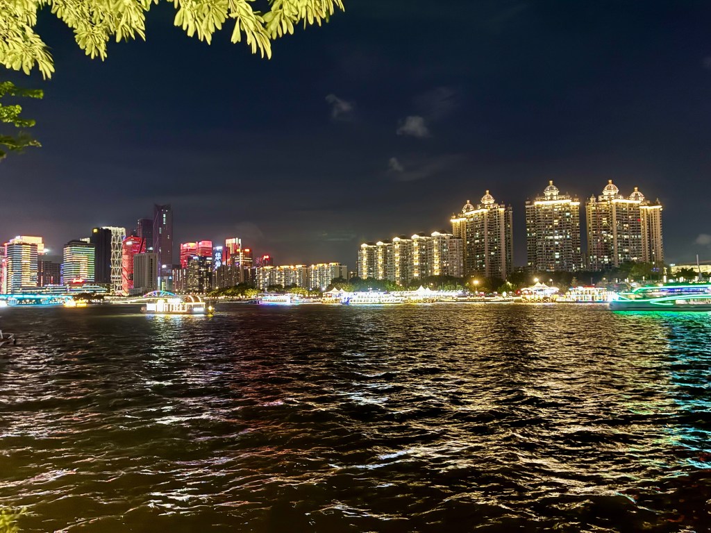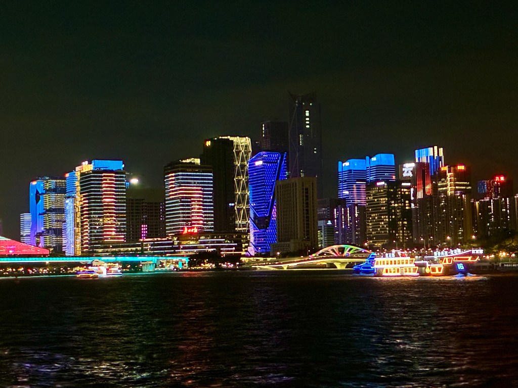 Guangzhou’s centre shines along the Pearl River, where the Canton Tower and tall glass buildings rise high above the water. During the day and night, boats move across the river and people fill the streets, giving the city a lively rhythm. At night, the lights from the tower and skyrises reflect on the water, turning the riverfront into a glowing scene that shows a city always full of energy.